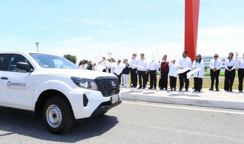 Ciudad Victoria, Tamaulipas.- El gobernador Américo Villarreal Anaya dio el banderazo de salida a los nuevos vehículos de la coordinación estatal del IMSS-Bienestar, que permitirán mejorar la eficiencia en el traslado del personal de esta institución en los ocho distritos en la entidad y servirán, además, como enlace de la estructura estatal con los hospitales y centros de salud.